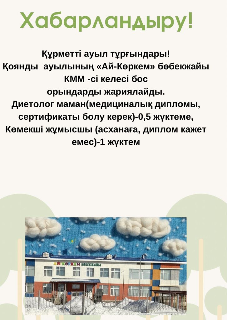 Құрметті ауыл тұрғындары! Қоянды ауылының «Ай-Көркем» бөбекжайы КММ -сі келесі бос орындарды жариялайды.